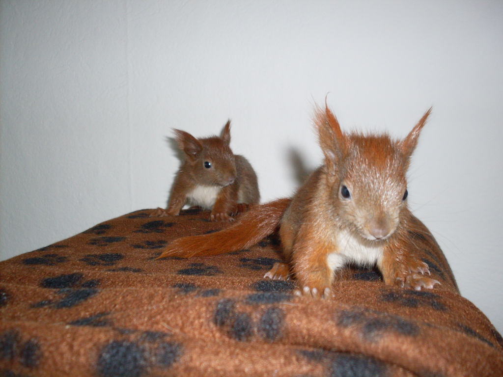 SDC10435Die beiden aus dem Nest gefallenen Eichhörnchen taten sich die ersten Tage sehr schwer. Sie tranken kaum und waren auch nicht an Brei oder feste Nahrung heranzuführen. Egal, was wir versuchten, sie nahmen es nur schwer an. Mit Mühe und Not und tierärztlicher Hilfe konnten wir gerade so das Gewicht aufrechterhalten.