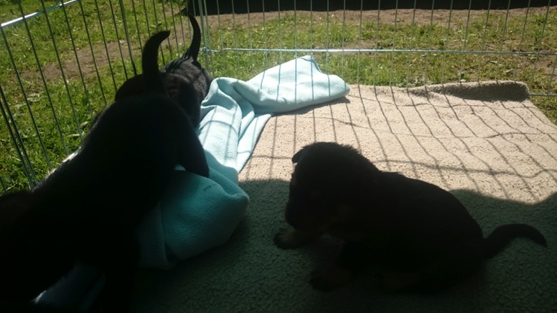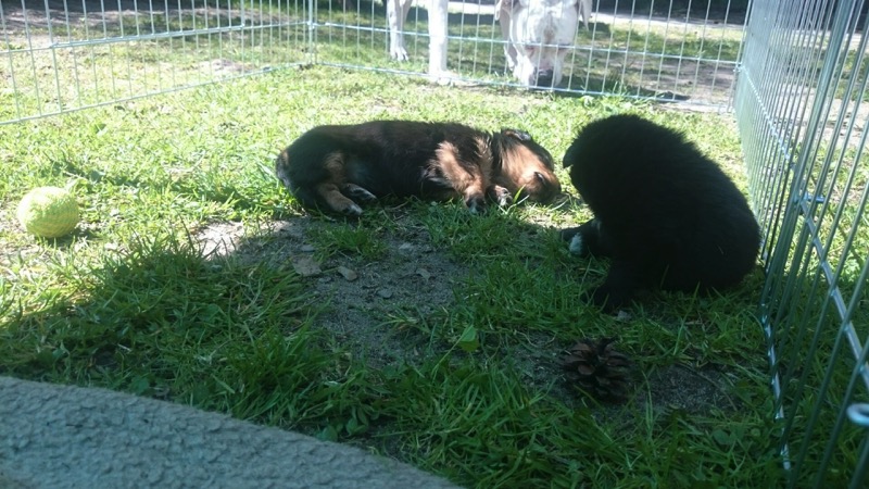 Eigentlich hatten wir das Gehege für unsere Nager angeschafft, weil es sich schnell umsetzen lässt. So können wir Kaninchen, Meerschweinchen oder vielleicht auch mal Hühner oder Gänse - die auch bereits bei uns abgegeben wurden - ohne großen Aufwand an einen anderen Standort bringen. Damit haben wir die Möglichkeit, den Tieren zusätzlich zu ihrem eigentlichen Gehege immer mal wieder eine neue Umgebung und neue Knabbermöglichkeiten zu bieten.Unsere Tierpfleger stellten fest, dass der Stall sich auch gut eignet für ein Sonnenbad unserer Welpen, die wir unerwartet beschert bekommen hatten.
