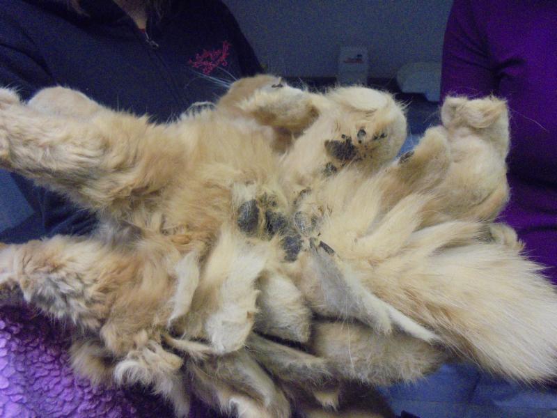 Da ihr Frauchen selbst pflegebedürftig war, konnte sie die Katze nicht mehr pflegen. Das Ergebnis war ein so stark verfilztes Fell, dass es schon fast so hart wie Beton war. In Platten hing es am Körper - teilweise so groß wie Frühstücksteller. Vermutlich litt sie starke Schmerzen an der Haut.