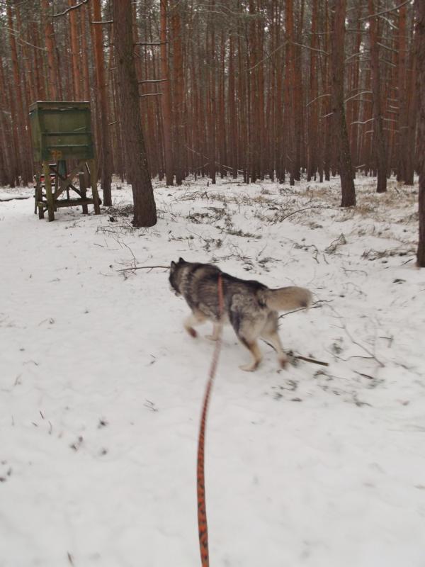 Tierpflegerin Kristin kam an ihrem freien Tag, um mit Yupek eine Extra-Runde durch den Wald zu laufen. Rehe, Hirsche, Wildschweine, Hasen, Füchse, Wölfe ... und wer weiß, was Yupek da noch alles an interessanten Spuren erschnüffelt hat.
