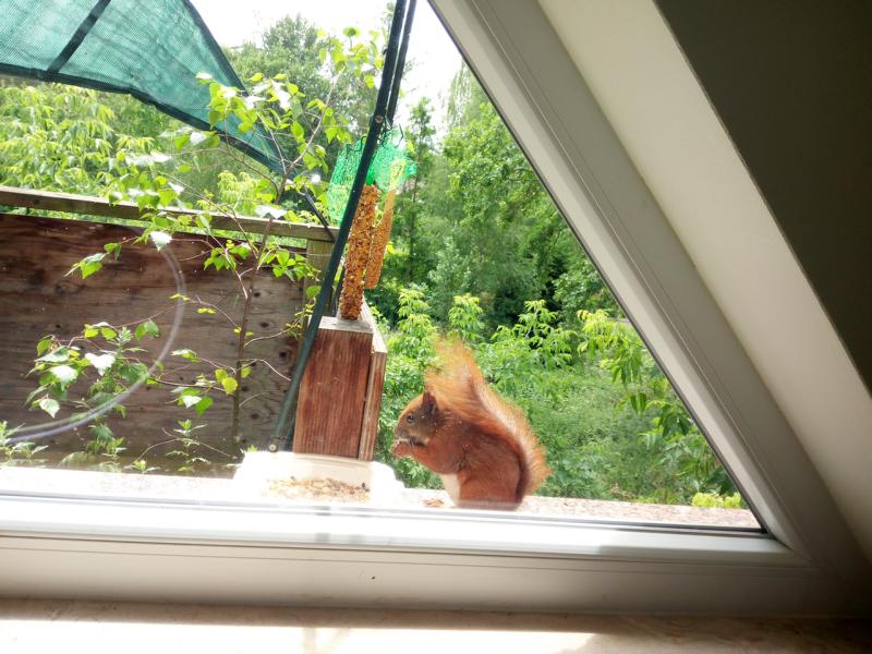 Mit einer der Kätzinnen hat sich die Eichkatzenmama sogar derart angefreundet, dass sie immer erst kommt und durch die Scheibe ins Zimmer schaut, ob ihre Lieblingskätzin in der Nähe ist. Mitunter geben sich die beiden sogar Küsschen durch die Scheiben. Dabei berühren beide tatsächlich mit ihrem Mäulchen gleichzeitg die Scheibe. Die Kätzin legt sich auch auf die Seite und beide versuchen, sich mit ihren Pfötchen zu tätscheln.