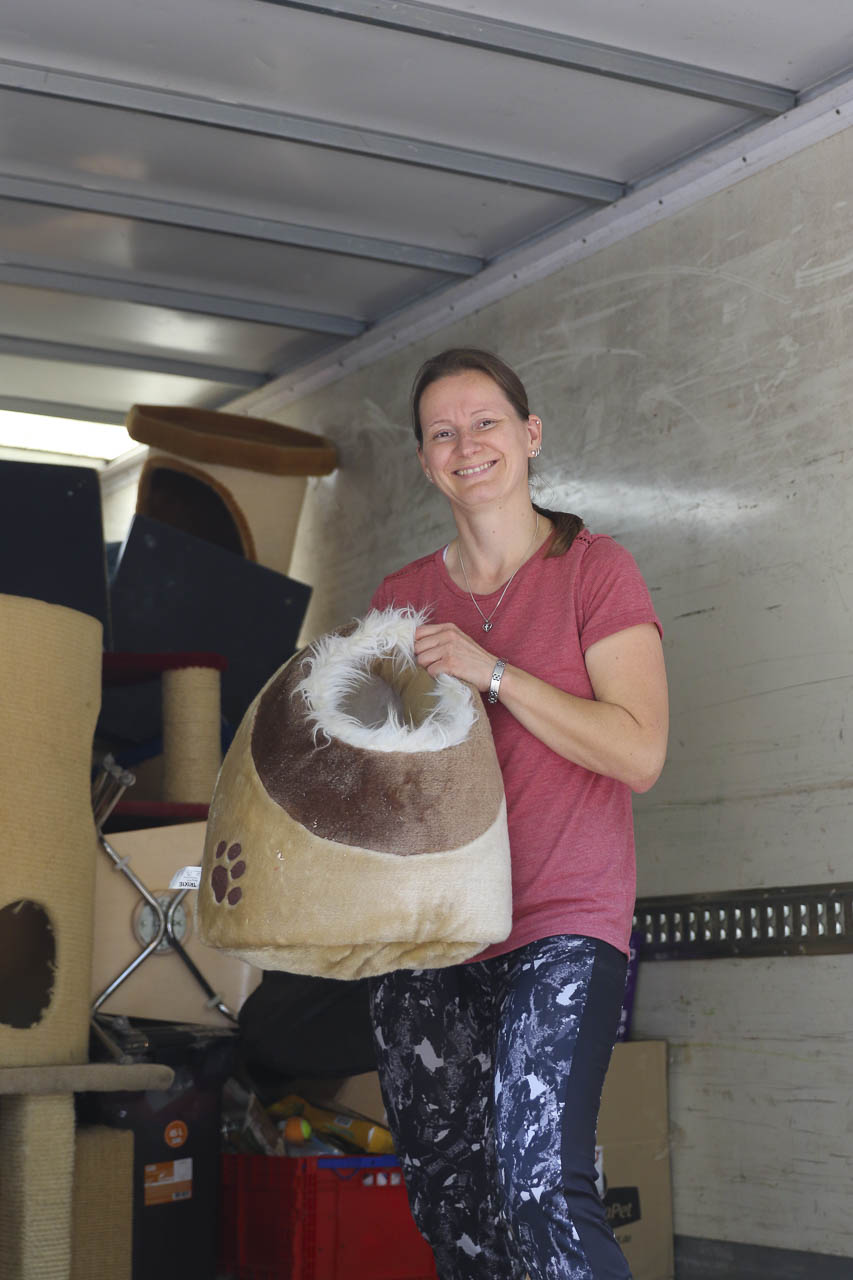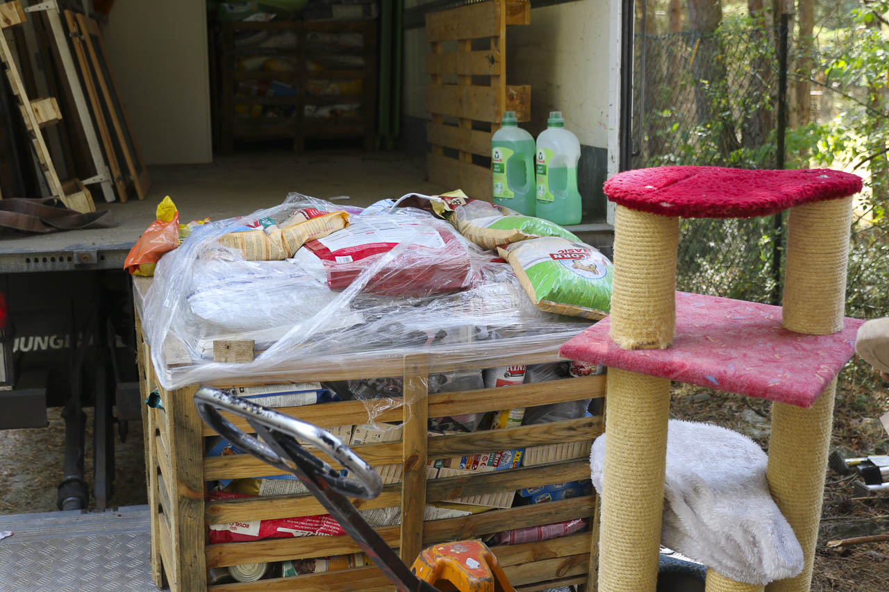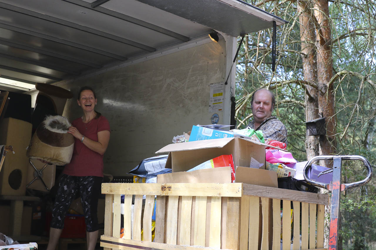 Und am nächsten Tag fuhr er dann noch zu lieben Tierfreunden nach Berlin, die ihren Verein auflösen. Auch dort durften wir uns nehmen, was wir wollten: Kratzbäume, Körbchen, Transportboxen, Gehegeteile ... Der LKW füllte sich.