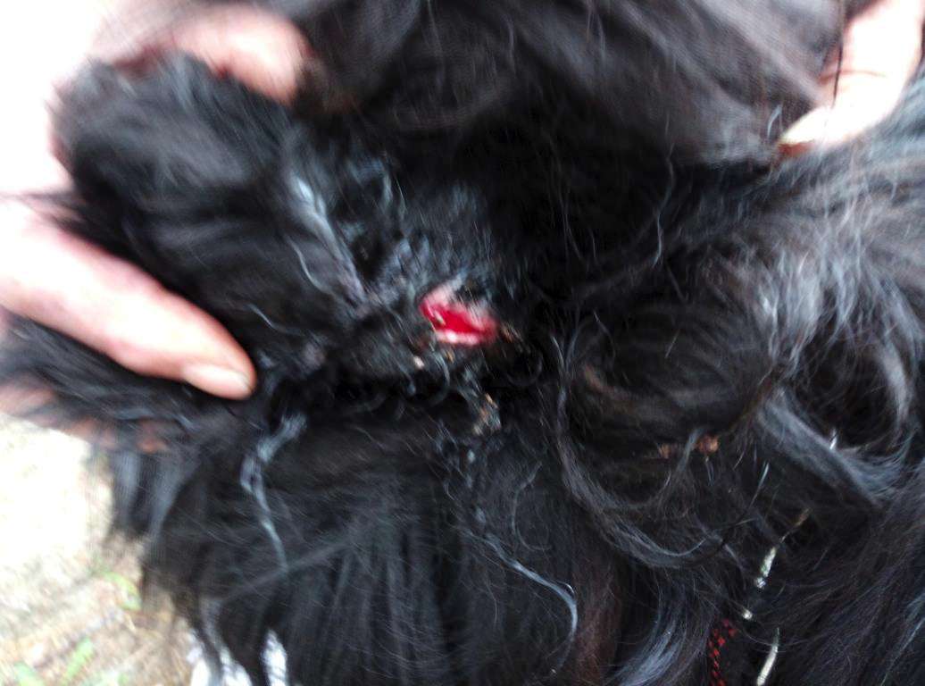 Eine unversorgte Wunde, die unter dem Schorf hervorkam, Würgehalsbänder, und dicke verhärtete Fellplatten machten deutlich, dass es Zeit für die Trennung wurde.