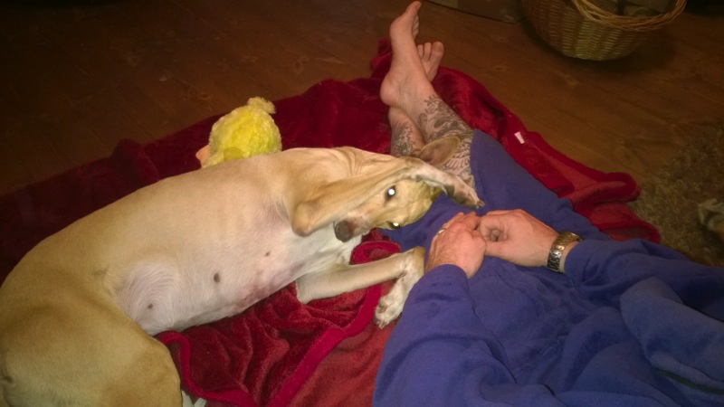 03"Hallo liebe Mitarbeiter, hier ein kurzer "Ankommbericht" von dem Goldstück..... Problemlos und dankbar für jede Zuwendung kam Amara bei uns zuhause an. Selbstverständlich nahm sie ihr Körbchen an. Orientiert sich viel an Cato, unserem Schäferhund. Unseren schwarzen Kater findet sie cool. Er sie übrigens auch. Die beiden Plüschrassekatzen.... Die sind so doof, die müssen erstmal angeblafft werden. Grins, aber auch das kriegen wir irgendwann hin. Unsere erste Begegnung mit Rehen hatten wir auch schon. Zum Glück ohne Probleme.  Obwohl die nur ca 5 Meter von uns entfernt auftauchten. Sie mag sich wohl erstmal nur von der Schokoseite zeigen. Das wunde Bäuchlein sieht langsam besser aus. Hat eine Tempurmatratze als Körbchen bekommen. Da drückt dann nix mehr.