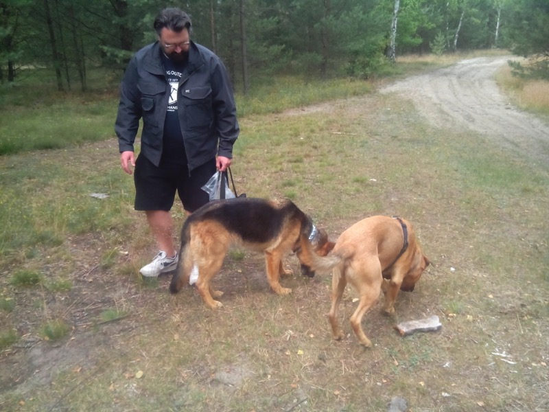 Mit seinem Kumpel Goliath (auch aus dem TH Verlorenwasser) gehen wir oft abends noch eine Runde Gassi. Anfangs hatte Rolf noch großen Respekt vor Goli, aber inzwischen sind sie ein nettes Gespann.