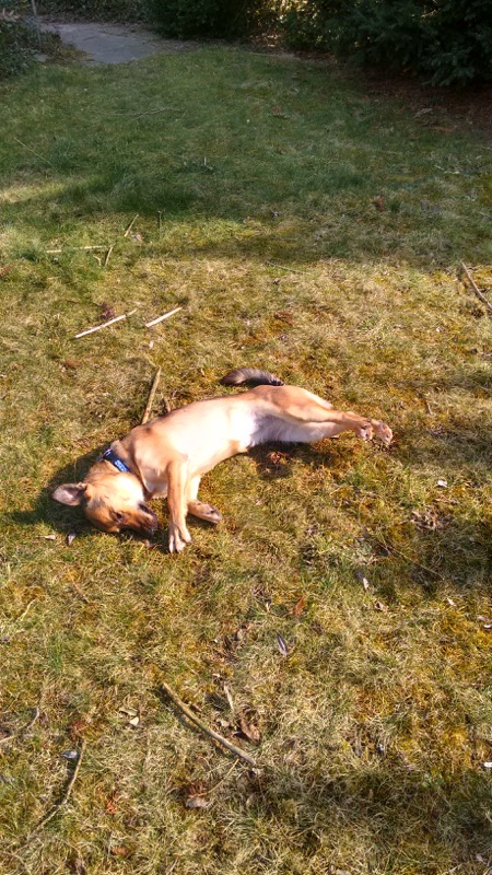 Mit anderen Hunden versteht sie sich mitlerweile ganz gut, obwohl wir das Gefühl haben, dass sie Rüden bevorzugt. Vielleicht liegt das daran, dass sie mit zwei Weibchen zusammen in einem Gehege war.