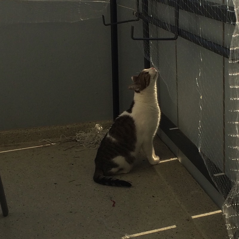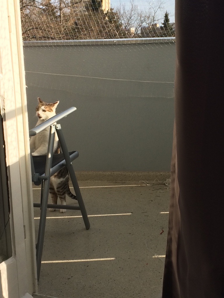 ich möchte euch ganz liebe Grüße schicken und euch wissen lassen, dass es mir sehr gut in meinem neuen Zuhause geht. Schon in der ersten Nacht habe ich alle Zweifel und Ängste verloren und habe mit meinen neuen Dosis in ihrem Bett geschlafen. Seitdem weiche ich Ihnen nicht mehr von der Seite, am liebsten Kuschel ich auf der Couch oder im Bett, aber auch meine eigenen Plätze mit Deckchen, Körbchen und Katzengras gefallen mir außerordentlich gut, ich kann mein Glück manchmal immer noch nicht fassen und sause quer durch die Wohnung und spiele "rutschender Teppich" auf dem Flur. Zu guter Letzt habe ich heute die Gelegenheit genutzt, um den Balkon im Sonnenschein zu begutachten. Das ist alles noch sehr aufregend für mich, deshalb bleibe ich lieber in der Tür sitzen und schnüffel die frische Luft, höre den Wind und die Vögel und lasse mir von hier die Sonnenstrahlen auf mein Fell scheinen.