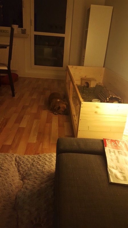 Im übrigen sitzt sie viel vor dem Gehege der Schweine und beobachtet sie wie Fernsehen gucken. Aber sie knurrt und bällt sie nicht an.