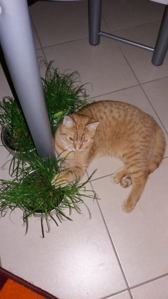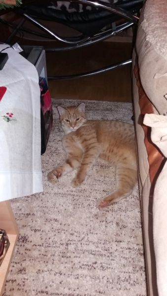 "Tabbi geht es sehr gut. Er fühlt sich wohl. Püppi ignoriert ihn und guckt ihn ab und an etwas böse an. Kasper und Tabbi beschnuppern sich. Tabbi geht immer auf Kasper zu. Kasper weis noch nicht so richtig. Also abwarten und Zeit lassen. Er frisst gut und geht auf die Katzentoiletten. Er ist so klug und flink. Ich hoffe alles wird gut." (Bild 1 und 2)