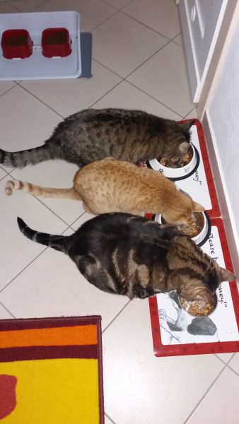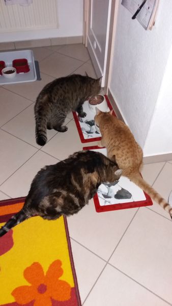 "Hallo, heute war mein 1. Arbeitstag nach meinem Urlaub. Die drei haben heute früh ganz schön traurig geguckt. Aber jetzt zu Hause endlich war grosse Freude angesagt. Haben alle drei geschlafen. Und jetzt wird gegessen." (Bild 5)