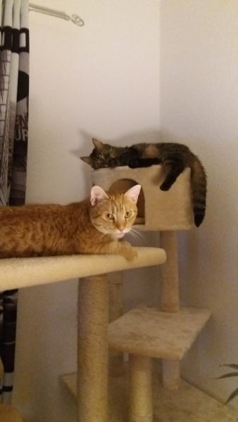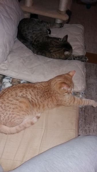 "Hallo hier mal wieder eine kurze Meldung. Kasper und Tabbi verstehen sich sehr gut. Die toben und spielen miteinander. Püppi hat auch keine Probleme mit ihm. Die drei fressen zusammen und der Kleine darf auch alle Liegeplätze von Kasper und Püppi benutzen. Kasper akzeptiert ihn. Nach 2 Wochen kann ich sagen Kasper und Tabbi - es scheint zu passen. Den neuen Kratzbaum finden beide toll. Alles ist so als ob Tabbi schon immer hier war. Ich freue mich, dass es so ist wie es ist. Ich kann nur sagen, dass Tabbi zu uns gehört. Er geht hier nicht mehr weg." (Bild 6, 7 und 8)