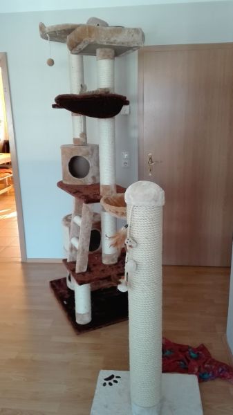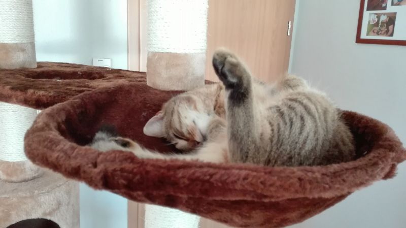 Ihren Lieblingsplatz haben die Beiden auch bereits schnell gefunden. Ganz oben auf dem Kratzbaum. Spielen und Streicheleinheiten sind an der Tagesordnung. Im seperaten Spielzimmer (ja richtig gelesen) steht eine große Kratztonne und viele Kartons zum verstecken und toben. Das Personal räumt mehrmals in der Woche um, damit es wieder was zu entdecken gibt. Achja, das große Bett vom Personal ist auch Klasse.