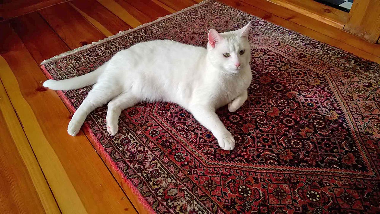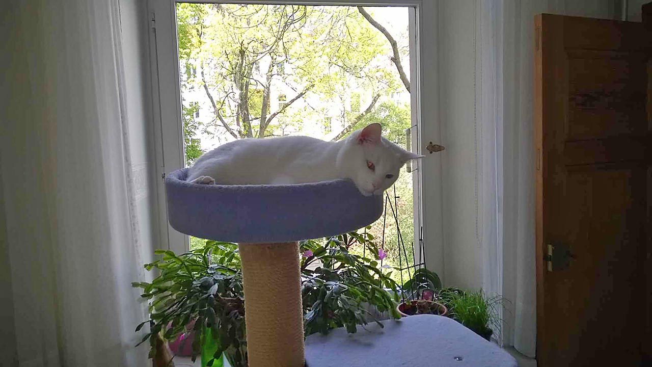 Sie rennt durch die Wohnung und hat auch mehrere Ruheplätze gefunden. Ich spiele oft mit ihr, um ihr etwas Bewegung zu verschaffen. Sie sitzt gern auf dem Kratzbaum in der Küche, schaut den Vögeln zu (sehr aufgeregt mit klappernden Zähnen) und mir bei der Hausarbeit. Auch der Balkon (mit Katzennetz!) gefällt ihr gut. Gestern hat sie an mich gekuschelt stundenlang mit mir ferngesehen. Sie sitzt gern auf dem Schoß. Alles in allem, eine Traumkatze, wie auch Frau Ott sagt.