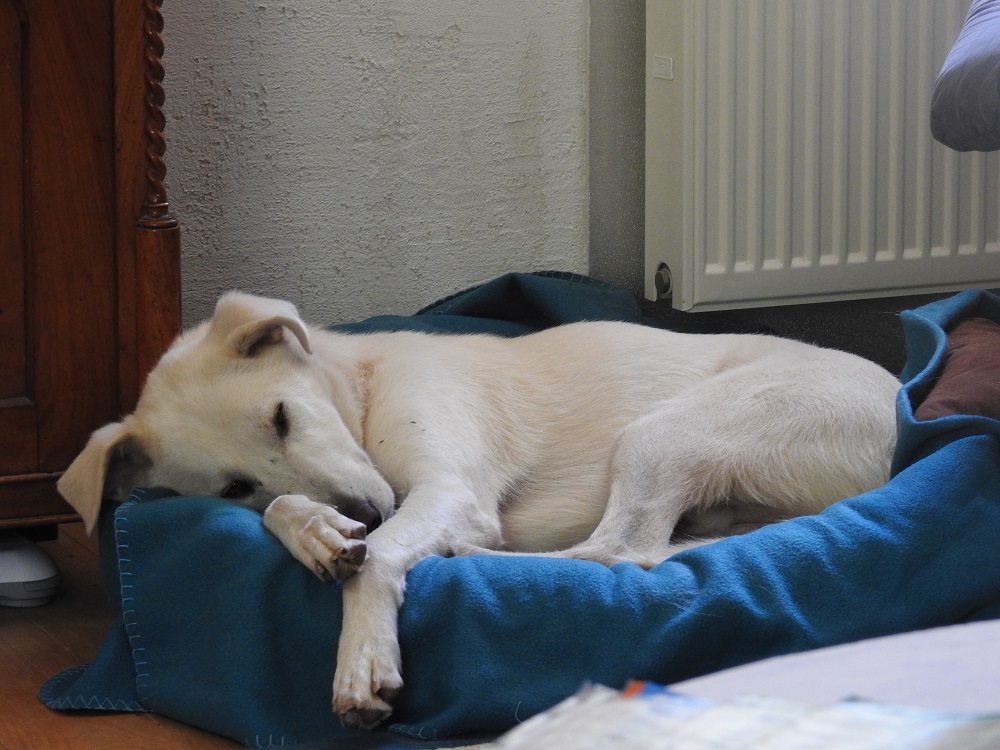 Gestern kamen meine Frau und Sohn zurück. Da ziert er sich noch ein wenig, aber ich bin mir sicher, dass er in Kürze auch sie ins Herz geschlossen hat, ein Schwanzwedeln hat er schon für sie übrig.