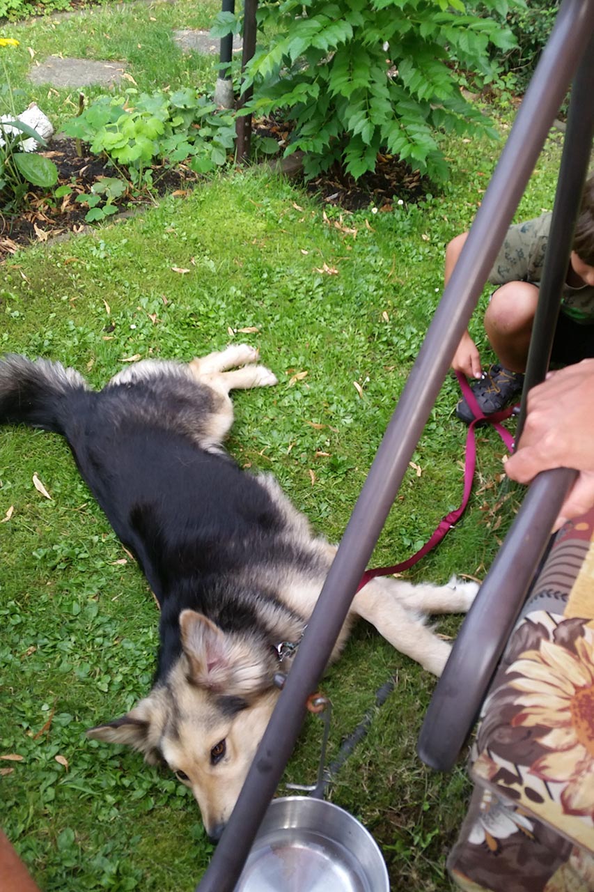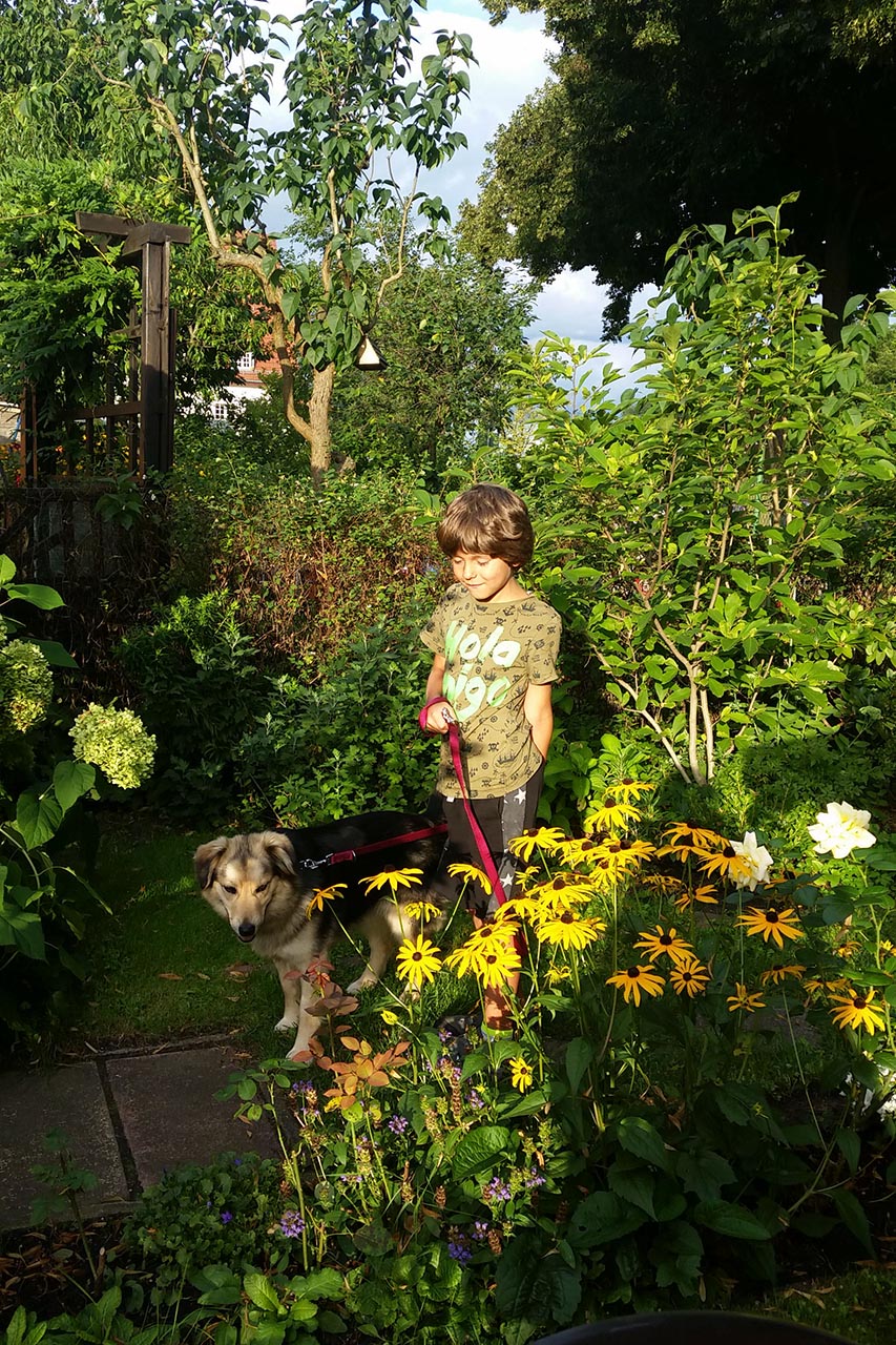 Erstmal haben wir sie im Garten an ganz langer Leine. Um sie daran zu gewöhnen. An die Umgebung. Anbei ein paar Fotos.
