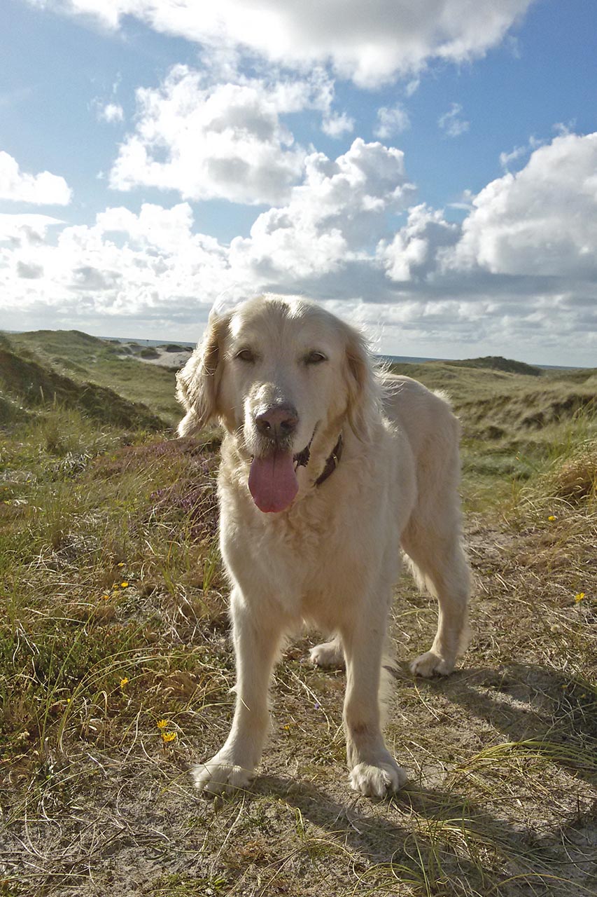 "Liebes Team von Verlorenwasser!Hier kommen ein paar sommerliche Grüße von Buddy!! Wir waren gerade in Dänemark im Urlaub, es war toll, Buddy fühlt sich dort sehr wohl. Die Temperaturen kommen ihm entgegen (18Grad) und Haus mit Garten OHNE Treppen ist natürlich herrlich. Buddy ist jetzt 12,5 Jahre alt!! Er ist sehr gemütlich geworden, schläft viel und lässt sich bekuscheln. Die drei Stockwerke schaffen wir mit einer Tragehilfe, das klappt gut. Sonst spaziert er sehr gemütlich durch seinen Kiez. Wir freuen uns jeden Tag über diesen Hund, seit fast 4 Jahren ist er jetzt bei uns. Viele Grüße an alle und im Anhang ein paar aktuelle Fotos.