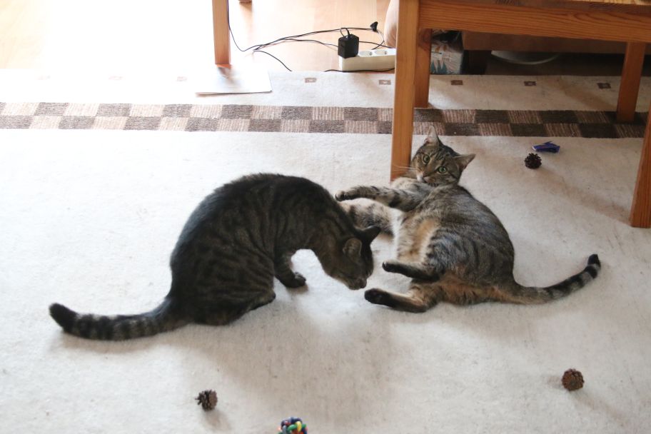 Sokka muss sich noch an Sukis Kuschelattacken gewöhnen, genießt es aber, eine Spielgefährtin zu haben. Die beiden toben gemeinsam durch die Wohnung und fressen nebeneinander, teilweise sogar gleichzeitig aus dem selben Napf.