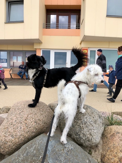 Auf den Fotos sieht man die Beiden nach einem ausgiebigen Spaziergang auf der Promenade von Kellenhusen - „Black und White“ vereint auf Steinen...