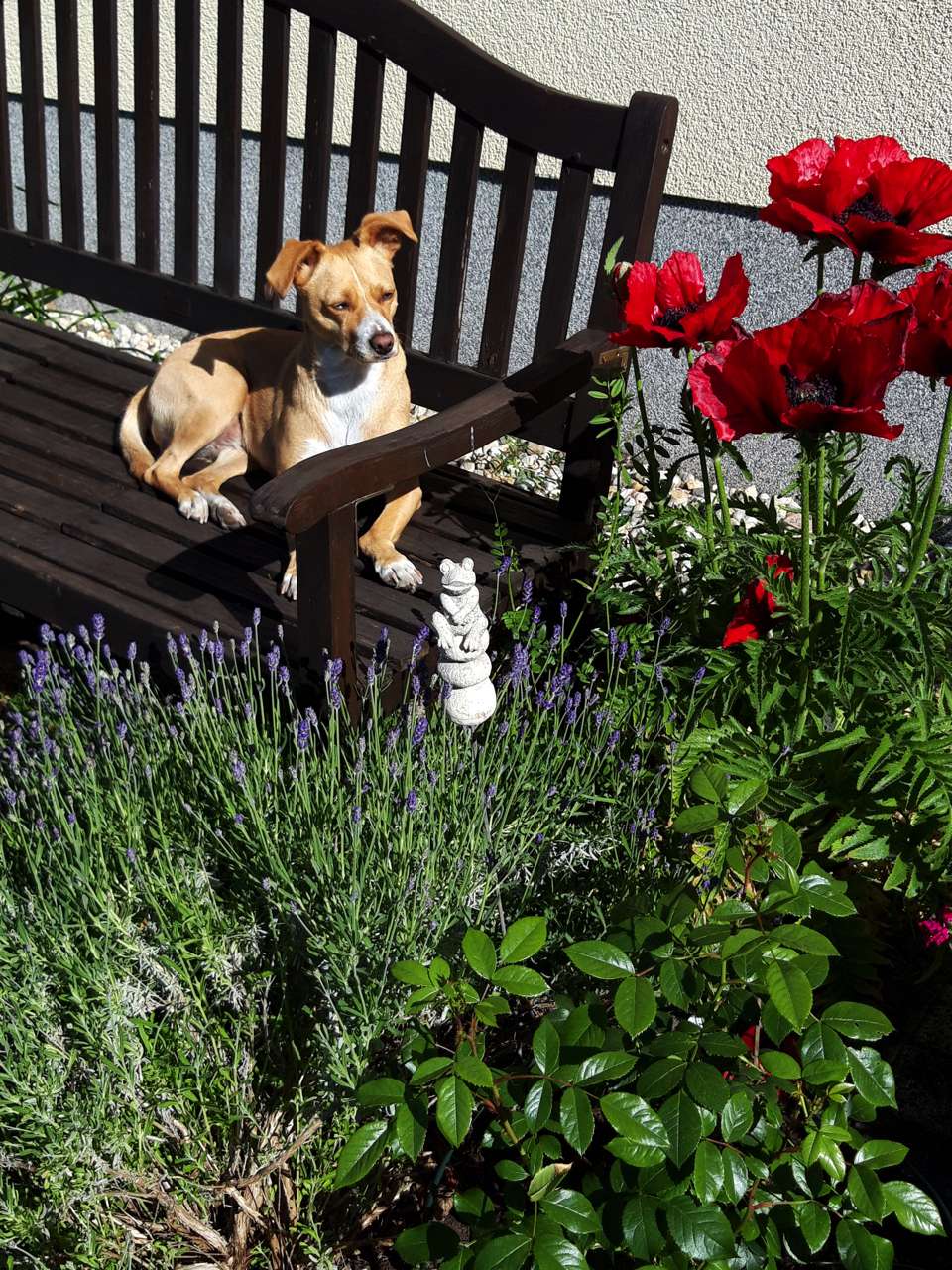 Sie hat sich im Garten einen Lieblingsplatz erobert, von dem aus sie alles im Blick hat und den sie nach einem ausgiebigen Waldspaziergang als erstes aufsucht. Trotz ihrer Pfote hat sie große Freude am Jagen im Wald, hört aber glücklicherweise (meist) sehr gut, wenn wir sie zurückrufen. Anschließend freut sie sich besonders über ein Leckerlie nach der großen Runde.
