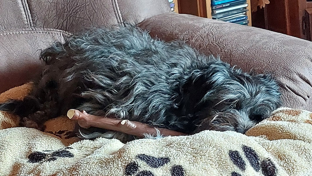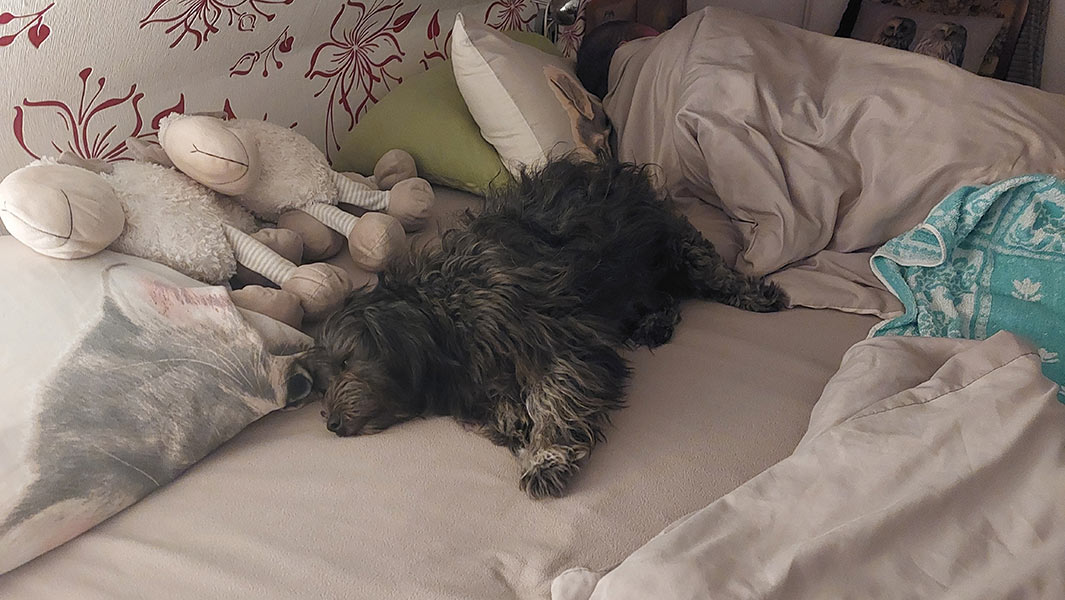 Dank ihrer Erstausstattung gab es mit ihrer Versorgung keine Probleme. Zuhause gab es noch die Bettchen, Decken und Reserven an Leckereien von unserer letzten Hündin Pauline, von ihr mussten wir am 14.4.23 schmerzlichen Abschied nehmen.