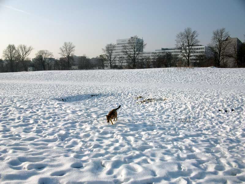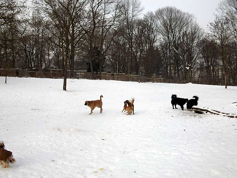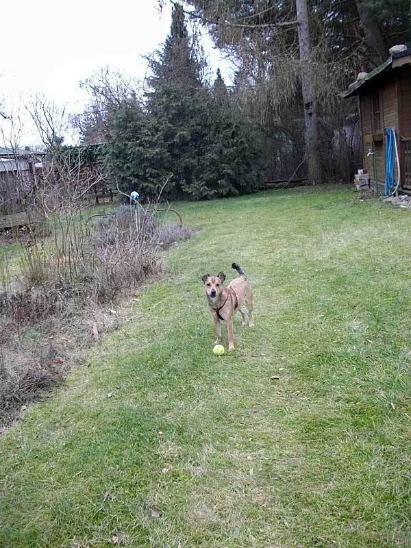 ich wollt mal wieder von mir hören lassen: mir gehts richtig gut! Ich gehe jetzt zur Hundeschule (warum das Hundeschule heißt, weiß ich nicht, weil, ich kann doch schon alles, sind doch meine Menschen, die was lernen müssen). Macht aber Spaß, ich treffe dort immer viele Kumpels. Ansonsten halte ich mein Rudel ganz schön in Schwung: mindestens viermal jage ich sie raus, bin eben ein flotter Terriermix. Wie gut, dass wir um die Ecke eine riesengroße "Hundewiese" haben. Das glaubt kein Dorfhund, dass es so eine große Wiese mitten in der Stadt gibt. Ich lege euch mal Fotos bei. Am Wochenende sind wir auch öfter bei Oma und Opa auf dem Dorf - da kann ich im Sommer in die Spree springen (hoffentlich ist bald Sommer!). Und ab und zu fahren wir ans große Wasser (Silvester war ich schon mal dort, und ich hatte gar keine Angst).