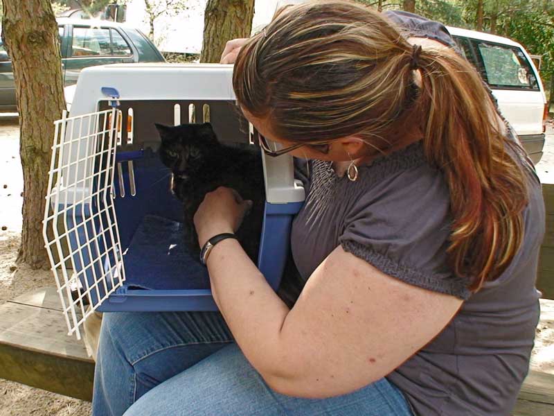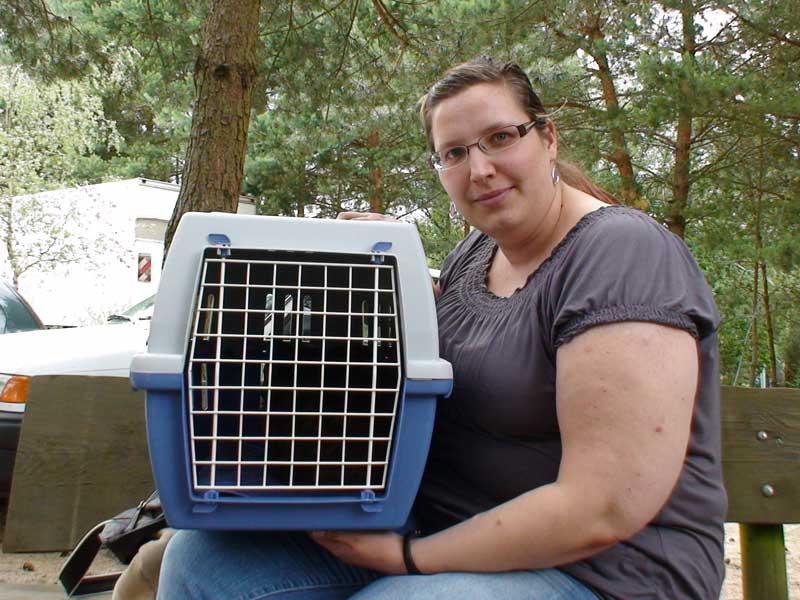 Auch die nette junge Frau, die sich nun ernsthaft der Katze annahm, bekam erst einmal tüchtig eins mit der Pfote übergeholfen. Doch anders als bisherige Besucher ließ sie sich nicht davon abschrecken und adoptierte Luzifa. Die Mieze mochte die ungewohnten Vorgänge so gar nicht, kroch unwillig in die Transportbox und kehrte uns nur noch ihr Hinterteil zu.