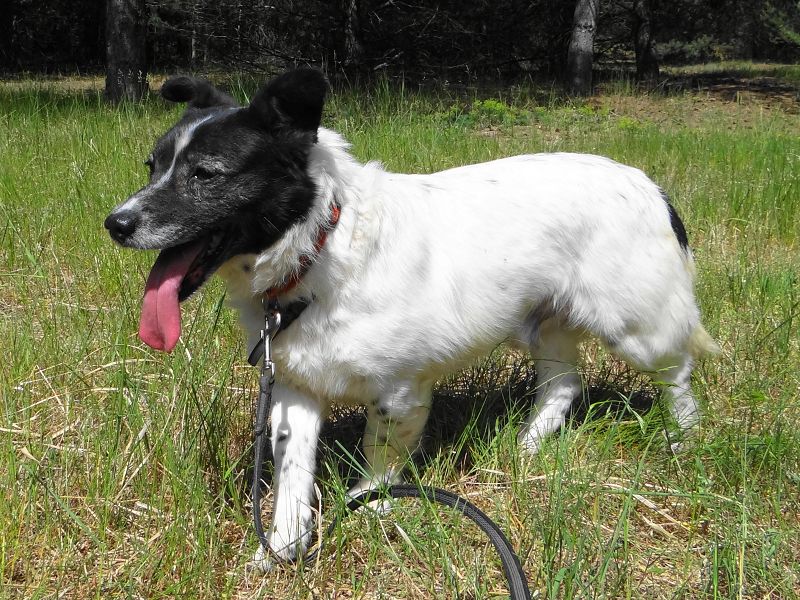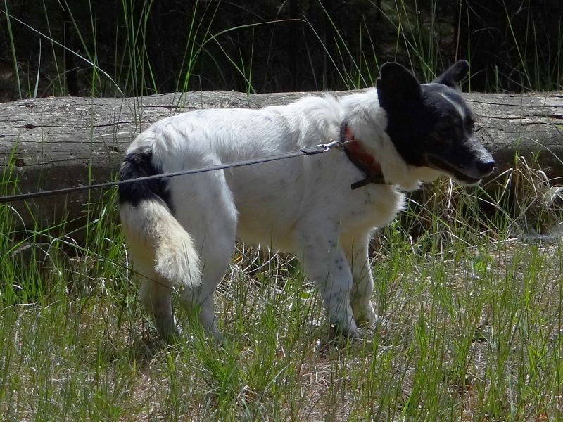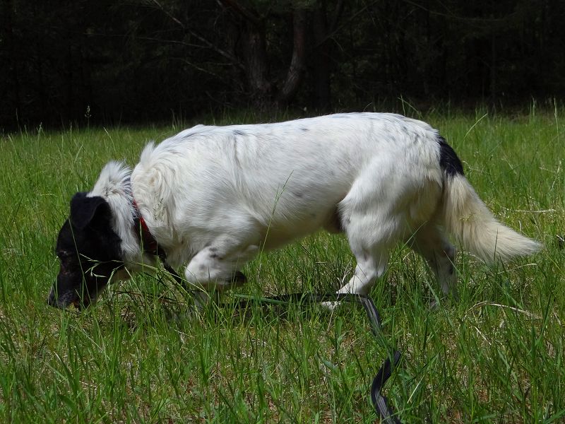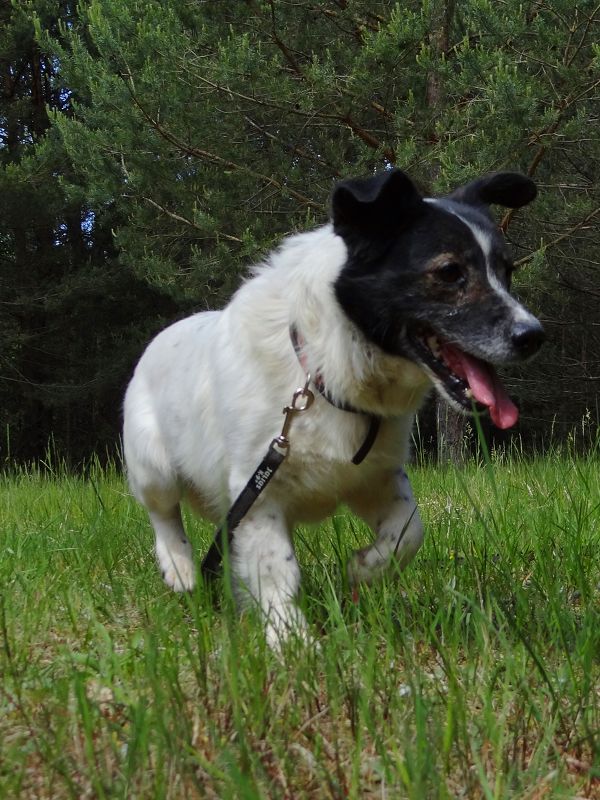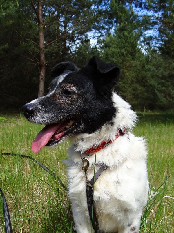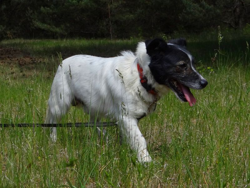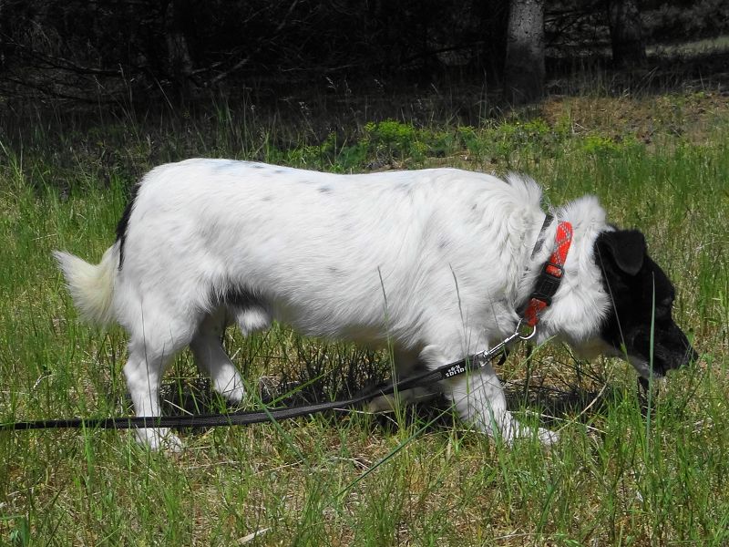 Er läuft super an der Leine, hält immer Blickkontakt zu seinem Menschen.