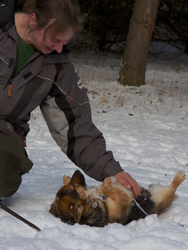 Schmuseeinheiten sind ihr noch wichtiger als Gassitouren. Deshalb hat sie sich auch einen Trick einfallen lassen: Sie wirft sich erst einmal auf den Rücken, um jeden zum Bauchkraulen zu animieren - und erst nach den entsprechenden Streicheleinheiten geht sie dann mit auf Tour.