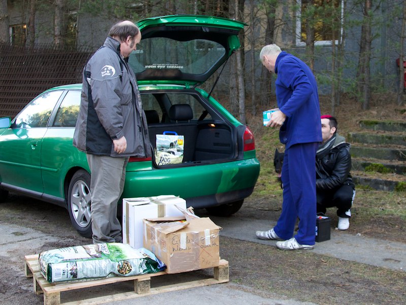 So begrüßte unser Tierheimleiter mit großer Freude den Chef Joogi (Bildmitte) und Renè (DJ Schäfchen, im Bild rechts). Sie brachten von den Hörern gespendete Pakete für den LKW mit Hilfsgütern.