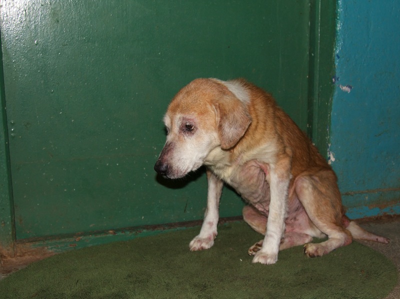 Ein Welpe, ja wie soll ich es beschreiben: Beide Ohren sahen wie abgeschnitten aus und sie hatte in der Nase ein Loch. Sie duckte sich, wenn man mit der Hand von oben kam. Ein Welpe von ca. 3-4 Monaten. Den verletzten Schwanz, der noch amputiert werden sollte, hatte ich noch gar nicht gesehen. Was hatte man diesem unschuldigen Baby angetan?
