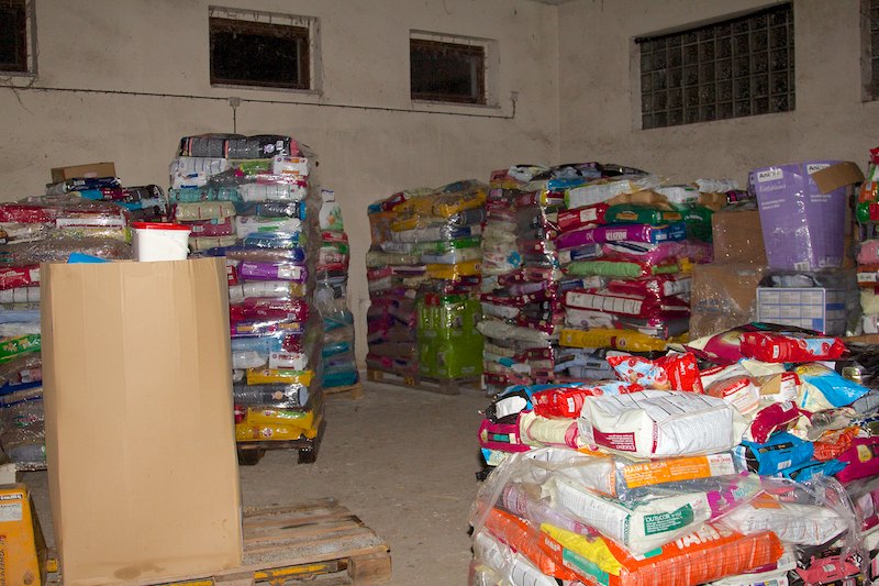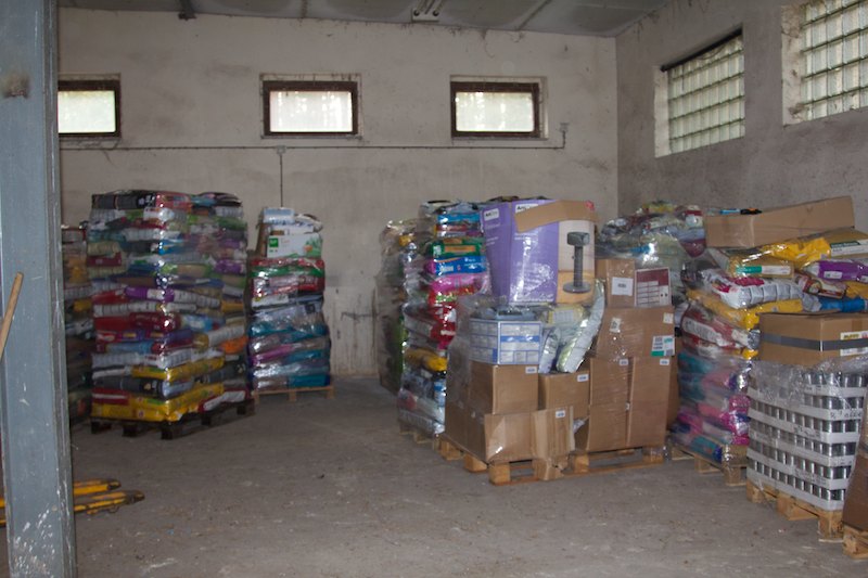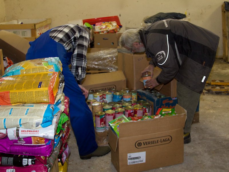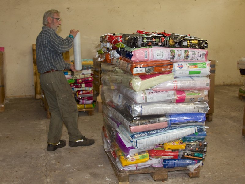 22 Tonnen Futter und Sachspenden mussten verpackt werden. Das sind 22.000 kg - eine kaum vorstellbare Menge. In Tüten, kleinen und größeren Paketen, großen Kartons, Säcken usw. war das Futter für die SMEURA bei uns abgegeben worden. Nun musste alles auf Paletten mit der richtigen Höhe zusammengepackt und rutschsicher eingestrecht werden. Ein echter Knochenjob. Und alles unter strenger Aufsicht von Hündin Joesi und Kätzin Saphira.