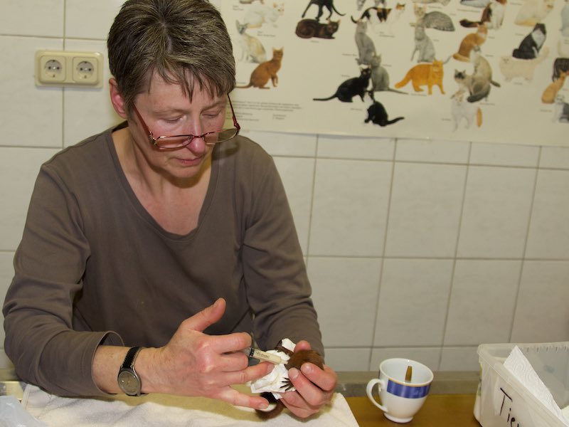 Tagsüber betreuen wir Hugo im Tierheim und nach Dienstschluss nimmt ihn unsere Tierpflegerin Liane mit nach Hause, um ihn dort weiter zu füttern.