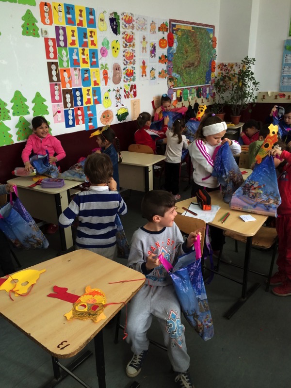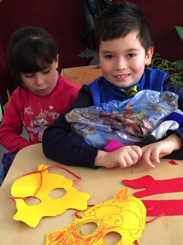 Nun erfuhren wir zu unserer Freude, dass jedes Kind seine Tüte erhalten hat. Während einer Zeichenstunde, in der mit unseren Malutensilien Tiermasken gefertigt wurden, durften die Kinder die Überraschung in Empfang nehmen.