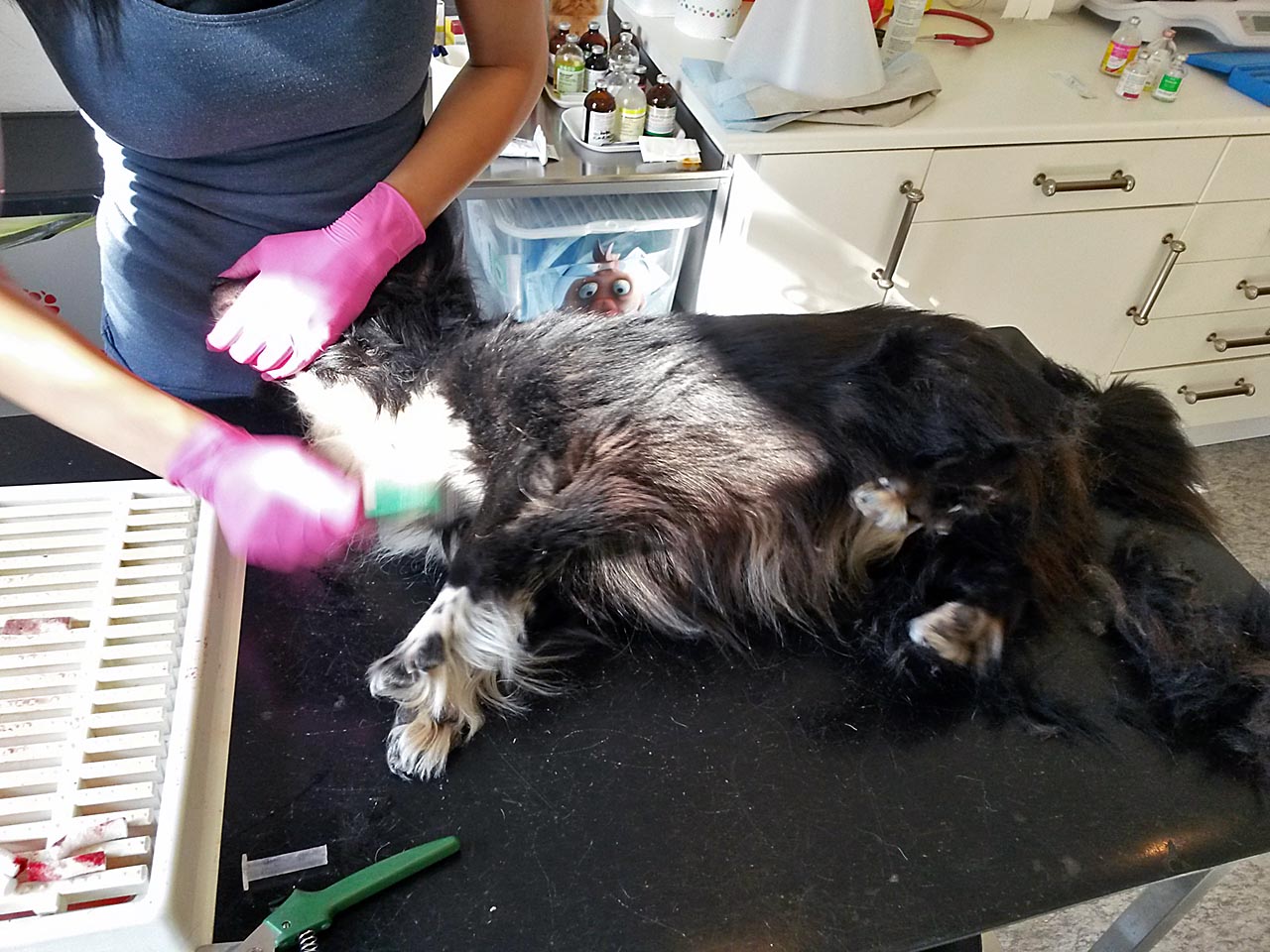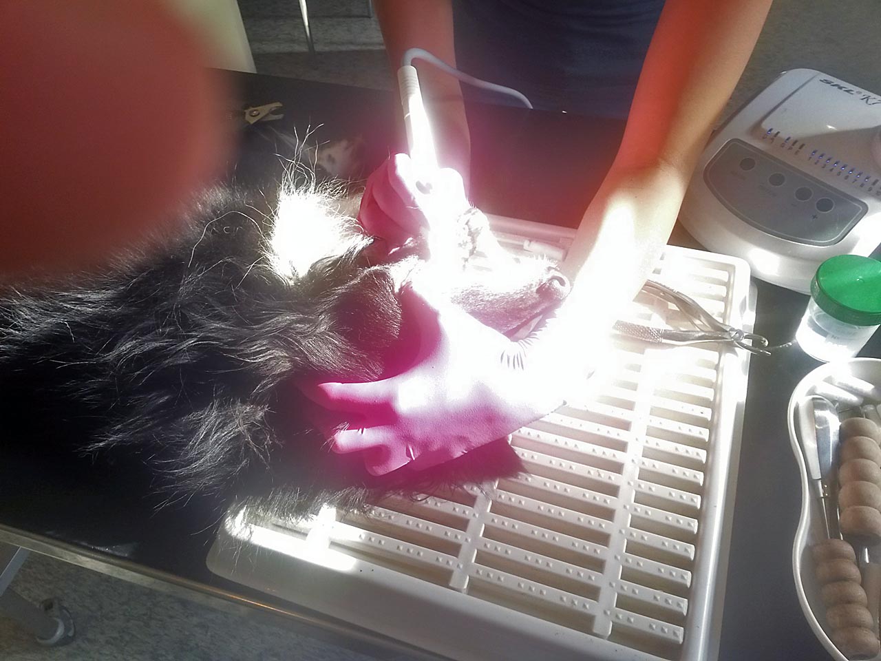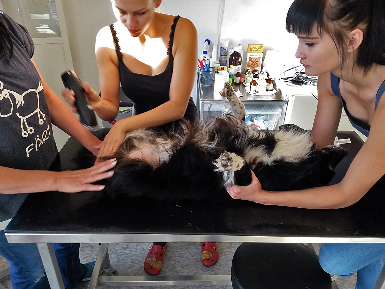 Natürlich wurden gleich noch Wolfskrallen geschnitten und Tiere mit stark verfilztem Fell, an die wir sonst nicht herankommen, geschoren.