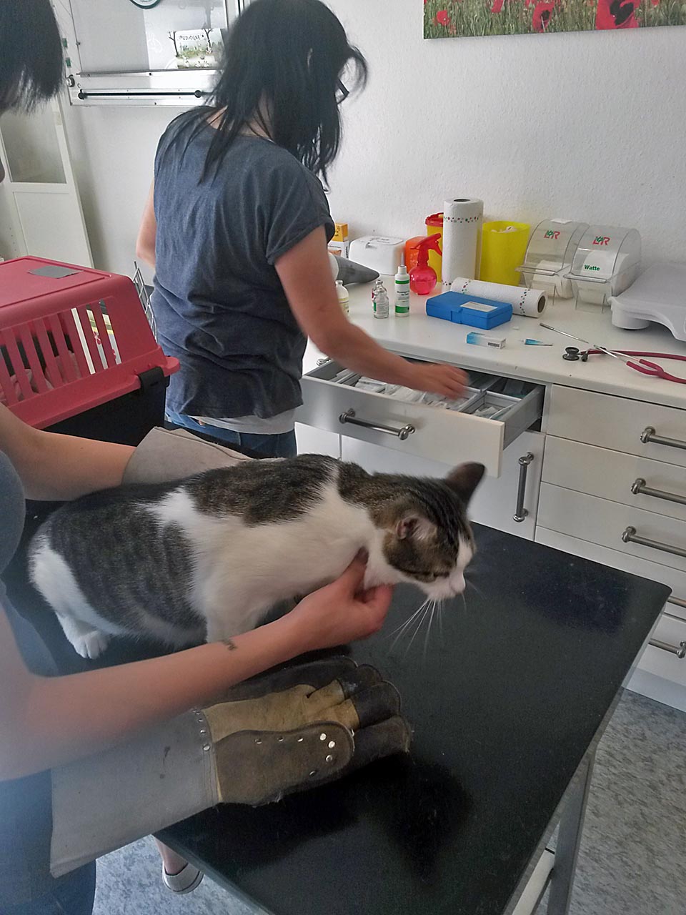 Die Katzen, die nicht kastriert waren, wurden gleich mit operiert. So mussten sie nicht zweimal in Narkose. Bei Tobias laserte Frau Dr. Höfer einen Tumor. Leider stellte sich heraus, dass nicht nur das Zahnfleisch, sondern auch der Knochen betroffen ist. Wir müssen nun schauen, wie der Tumor sich weiter entwickelt.