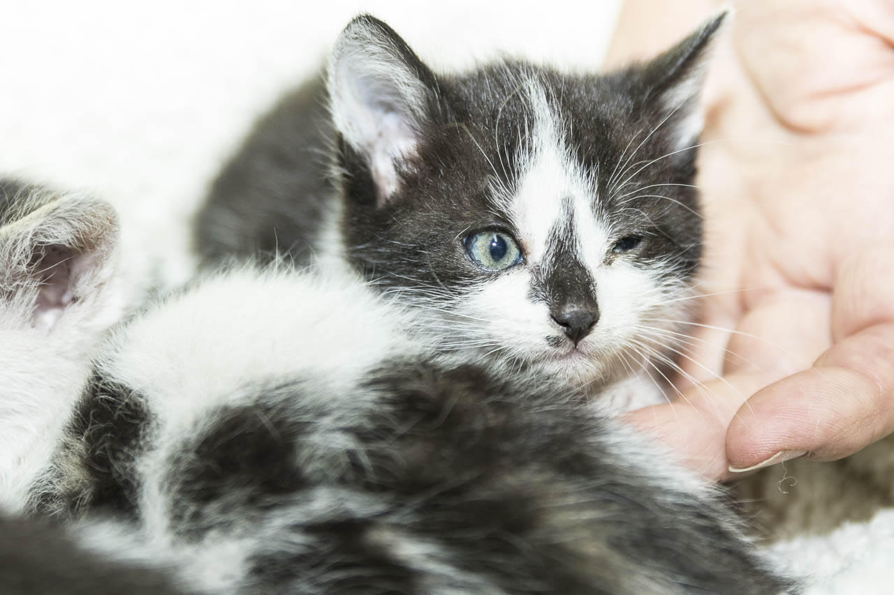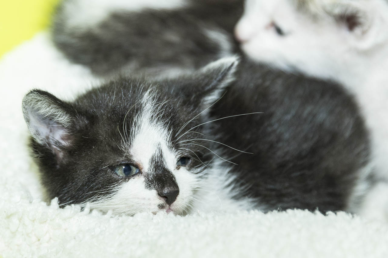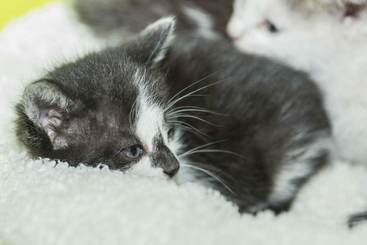 Das grau-weiße Kitten mit den helleren Öhrchen ist ein Junge.