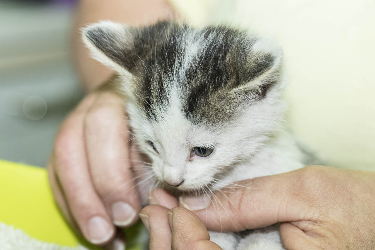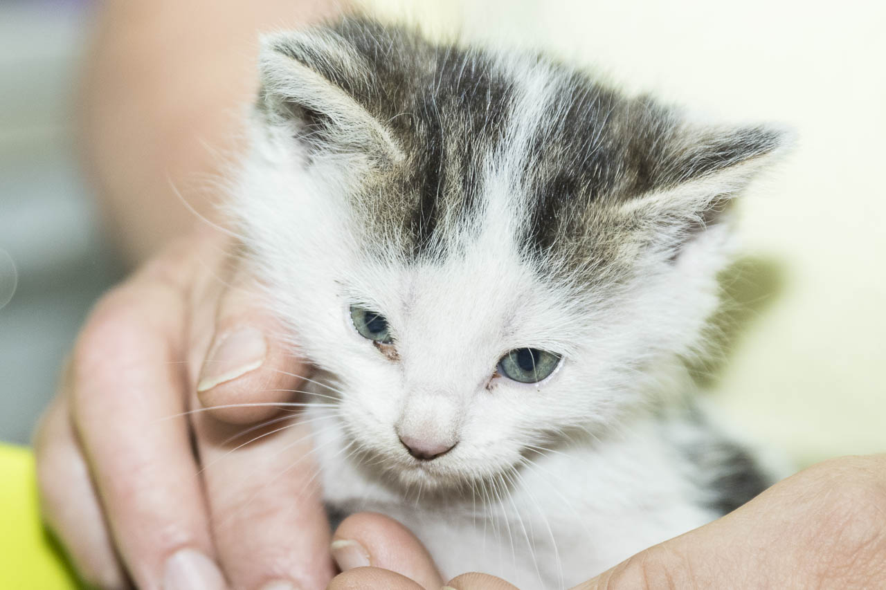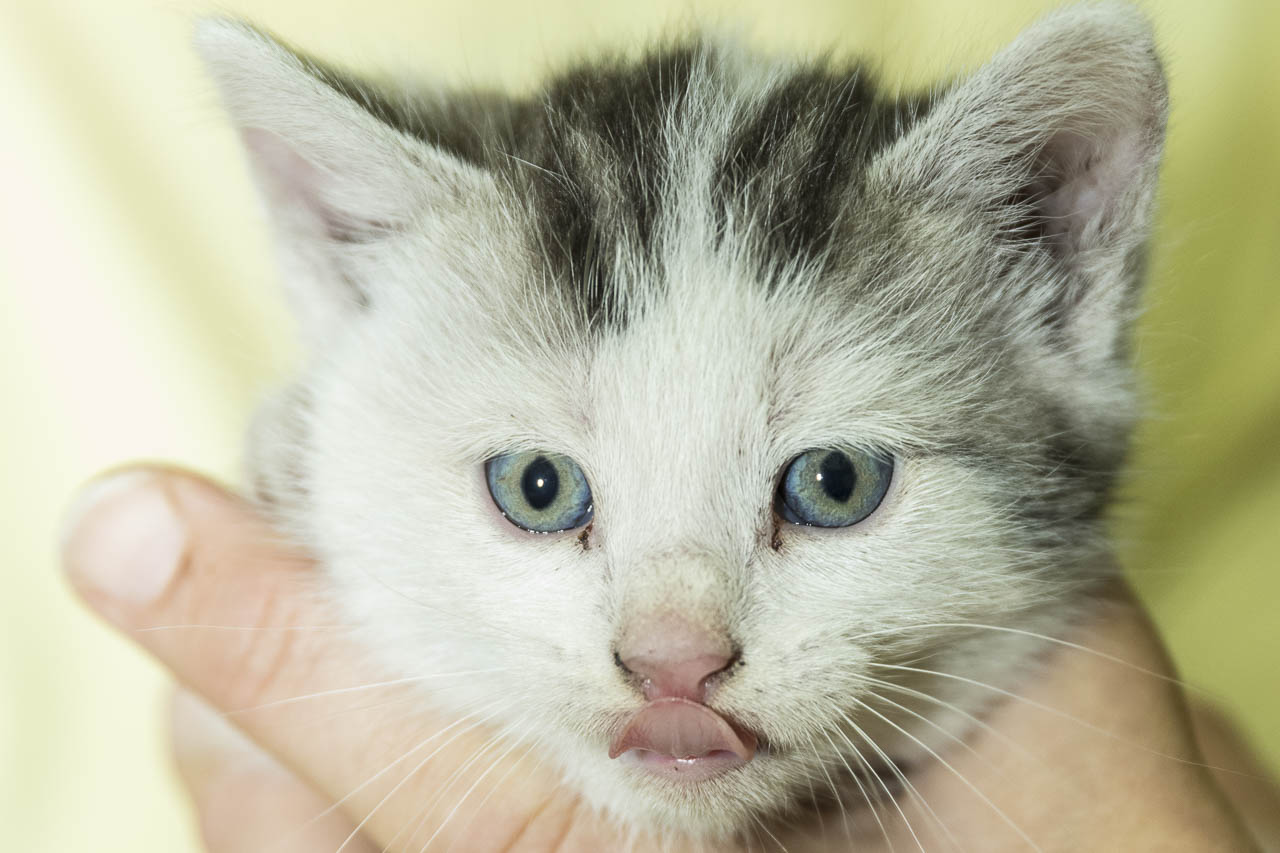Das grau-weiße Kitten mit den dunkleren Öhrchen ist ein Mädchen.