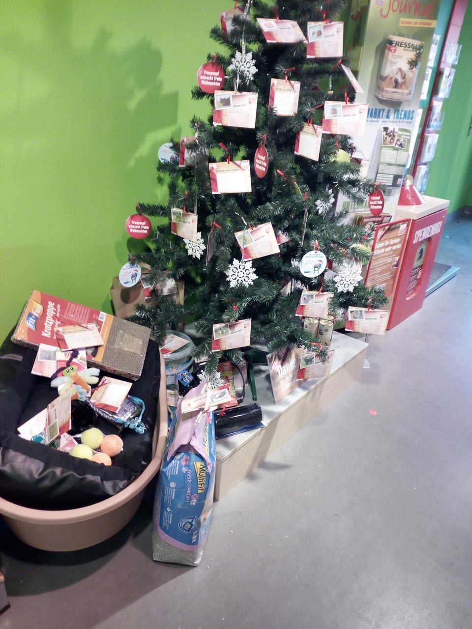 Sie wird von den Tierfreunden so gut angenommen, dass unser Tierheimleiter bereits zum Fressnapf in der Goerzallee kommen durfte, um die ersten Spenden abzuholen, denn der Sammelcontainer war bereits übervoll und kein Platz mehr unter dem Weihnachtsbaum.