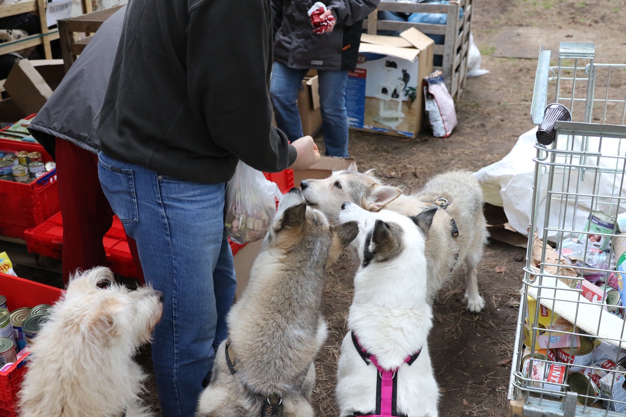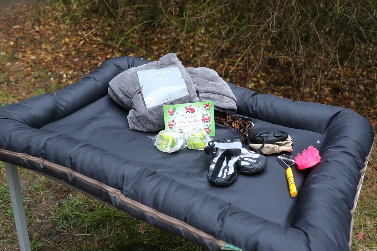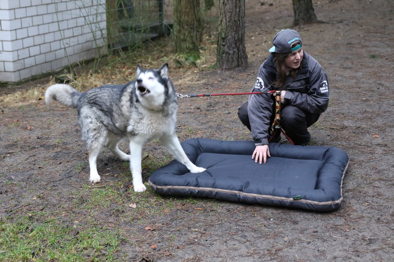Einige Post-Pakete waren noch nicht ausgepackt, darunter eine große Lieferung für Yupek. Er bekam von Tierfreundin Steffi eine eigene schöne neue Ausstattung. Das Bett wurde von Yupek gleich nach dem Auspacken in Augenschein genommen und mit einem Husky-Lied begrüßt.