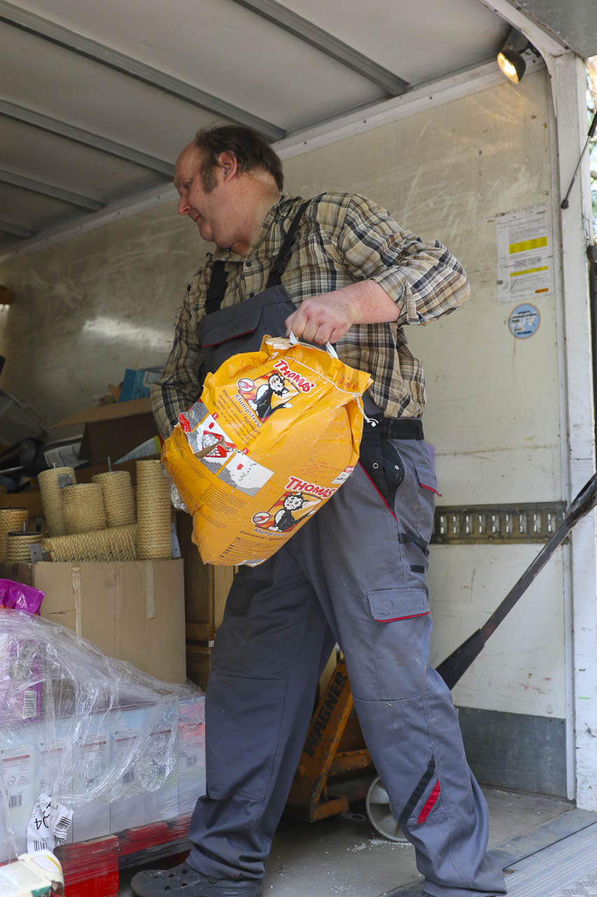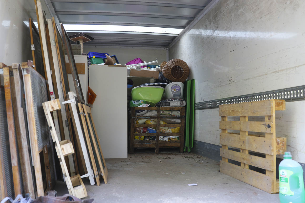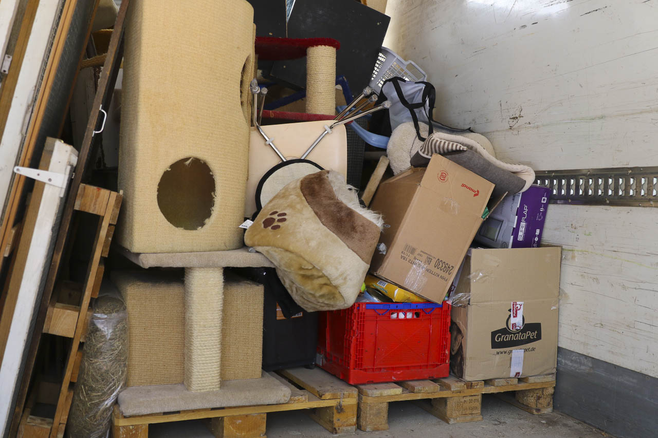 Und am nächsten Tag fuhr er dann noch zu lieben Tierfreunden nach Berlin, die ihren Verein auflösen. Auch dort durften wir uns nehmen, was wir wollten: Kratzbäume, Körbchen, Transportboxen, Gehegeteile ... Der LKW füllte sich.