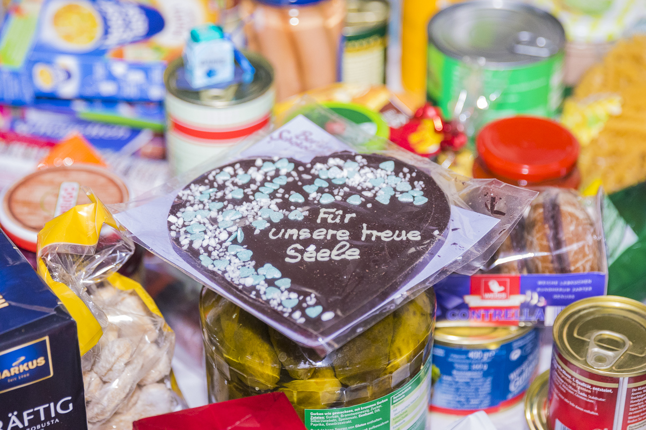 Zwei Pakete waren noch nicht ausgepackt, als unser Fotograf die Aufnahmen gemacht hat. Ein Mitarbeiter hat dann unserem Helfer alles nach Hause gefahren, denn mit dem Rad hätte er die vielen schönen Dinge nicht wegbekommen.