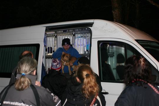 So war es schon dunkel, als das Fahrzeug eintraf. Trotzdem muss dann natürlich die Aufnahmeprozedur sein. Chip mit Impfpass und Transportliste abgleichen, erster Gesundheitscheck und Test, wer mit wem zusammen wohnen kann. Zwei Tage später dann noch die Untersuchung vom Tierarzt, was den meisten Tieren auch unheimlich ist.