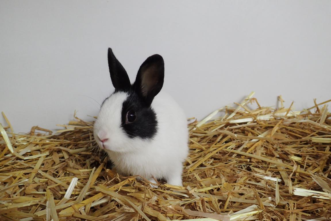 Die schwarz-weiße Häsin heißt Rhea.