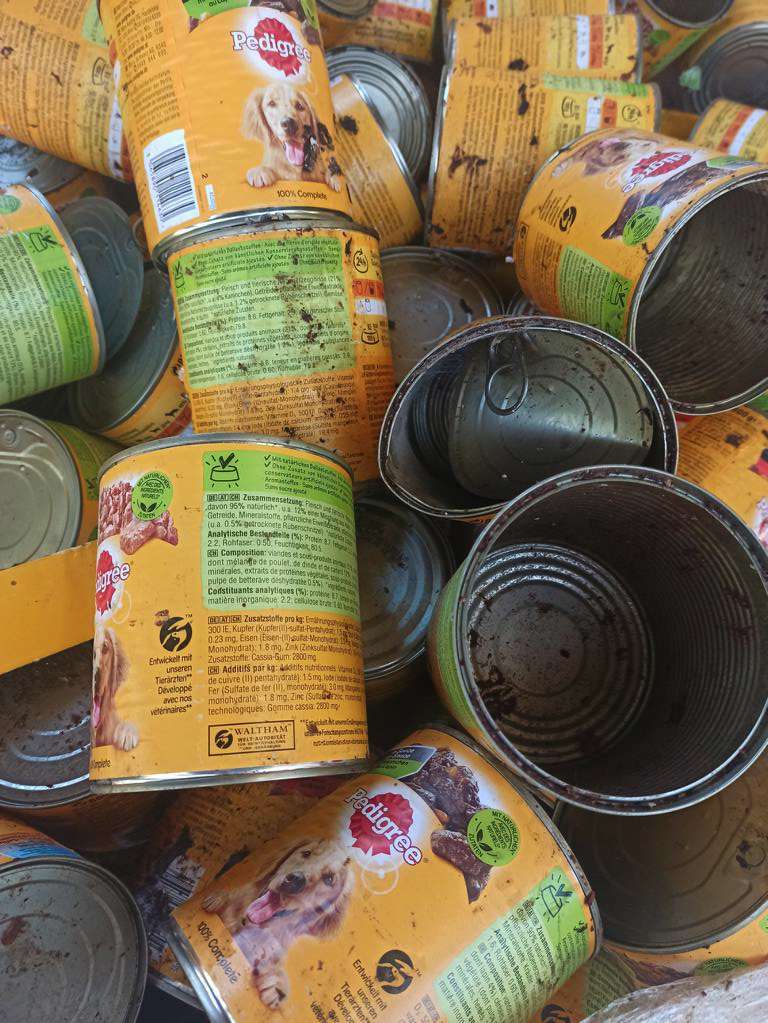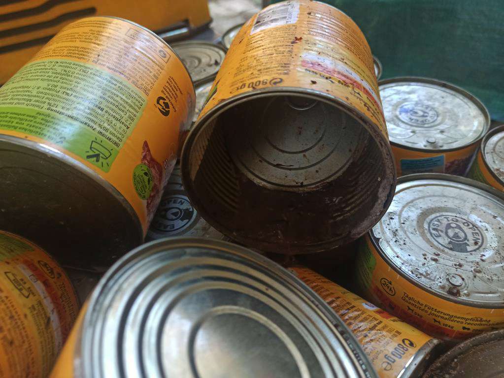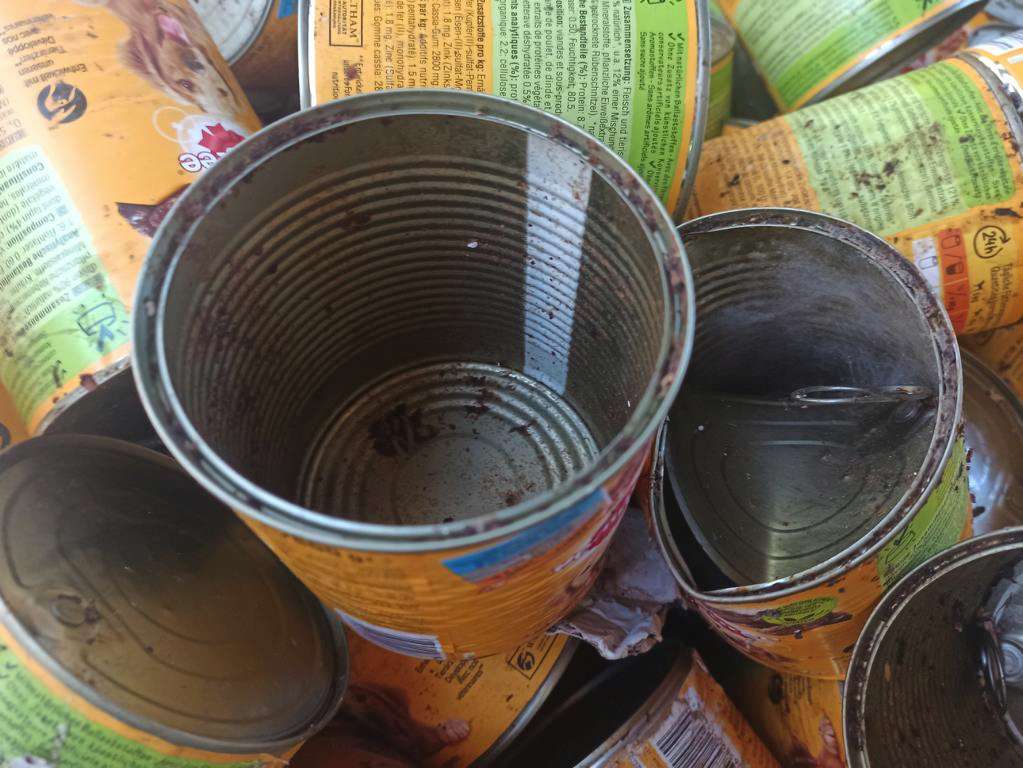 Als wir sie holen wollten, stellten wir fest, dass sich da jemand gütlich getan hatte. Die Dosen waren durcheinandergewirbelt und bekleckert, einige Dosen waren geöffnet und ausgeschleckt.😮