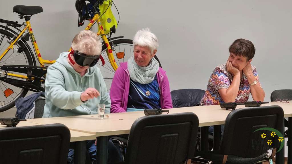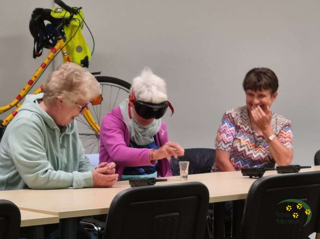 Zunächst gab es einen Theorieteil, der auch für erfahrene Autofahrer viel Neues enthielt. Besonders amüsant war eine Übung, bei der Münzen in einen Becher geworfen werden mussten - zunächst ganz normal - dann mit einer 3-D-Brille, die die Auswirkungen von Alkohol simulierte. Wir waren überrascht von dem deutlich fühlbaren Unterschied.