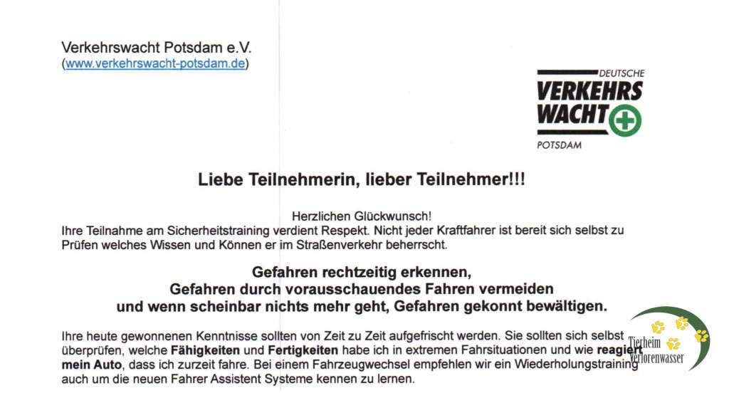 Angesichts von 8 Unfalltoten täglich! auf Deutschlands Straßen, können wir einen Kurs bei der Verkehrswacht Potsdam in der Pirschheide (beim ehemaligen Hauptbahnhof) nur wärmstens empfehlen: