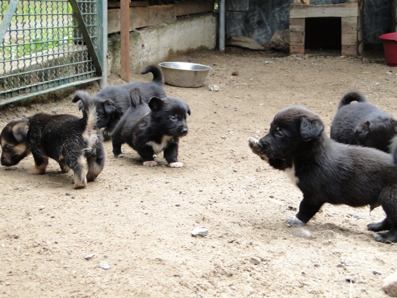 Da wir extrem voll sind, gab es keinen geeigneten Zwinger für die Kleinen. So bringen wir sie tagsüber in einem stillgelegten Kaninchenauslauf unter, damit sie auch genügend toben können.