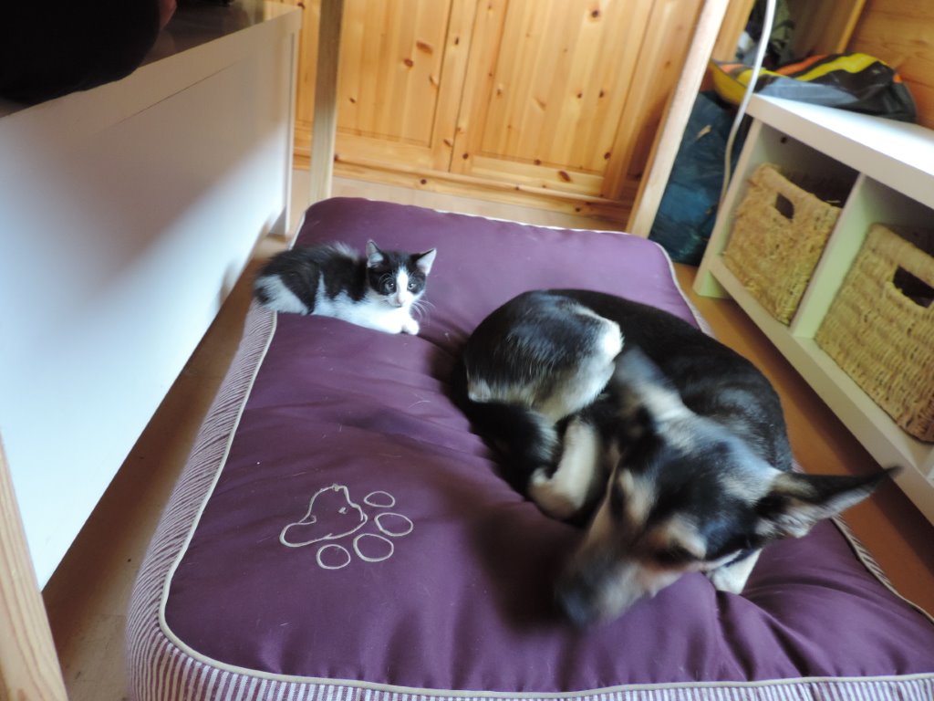 Wir Ihr alle sehen könnt geht es mir bei meiner Familie richtig gut, jeden Morgen gehe ich mit Frauchen und meinen Hundefreunden in den Wald da wird dann ordentlich getobt. Später muss ich mich dann um meine ``Herren`` kümmern. Seit kurzen bin ich ja auch Katzenmama, es ist gar nicht so einfach einen anständigen Hund aus ihm zu machen. Wie man sieht hab ich alle Pfoten voll zu tun.