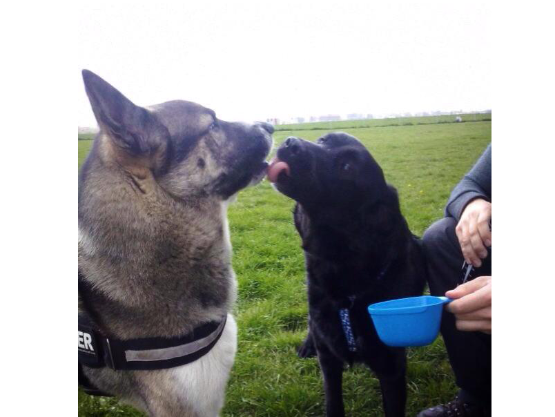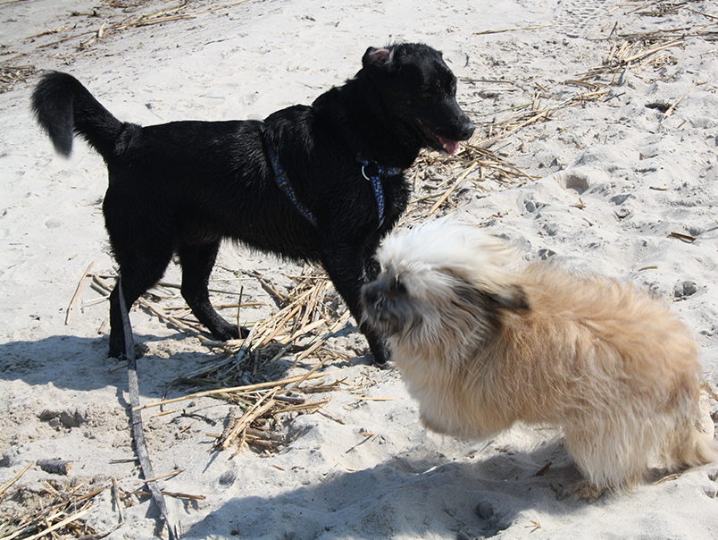 Nach anfänglichem Gebelle und Gezerre geht er freudig schwanzwedelnd auf die anderen Hunden zu und es wird ausgiebig geschnuppert.