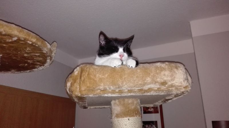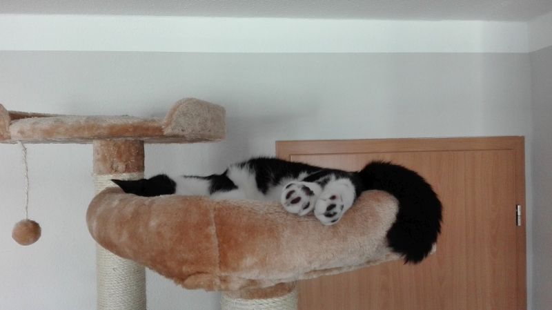Ihren Lieblingsplatz haben die Beiden auch bereits schnell gefunden. Ganz oben auf dem Kratzbaum. Spielen und Streicheleinheiten sind an der Tagesordnung. Im seperaten Spielzimmer (ja richtig gelesen) steht eine große Kratztonne und viele Kartons zum verstecken und toben. Das Personal räumt mehrmals in der Woche um, damit es wieder was zu entdecken gibt. Achja, das große Bett vom Personal ist auch Klasse.